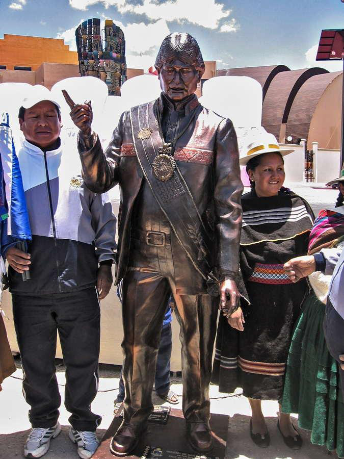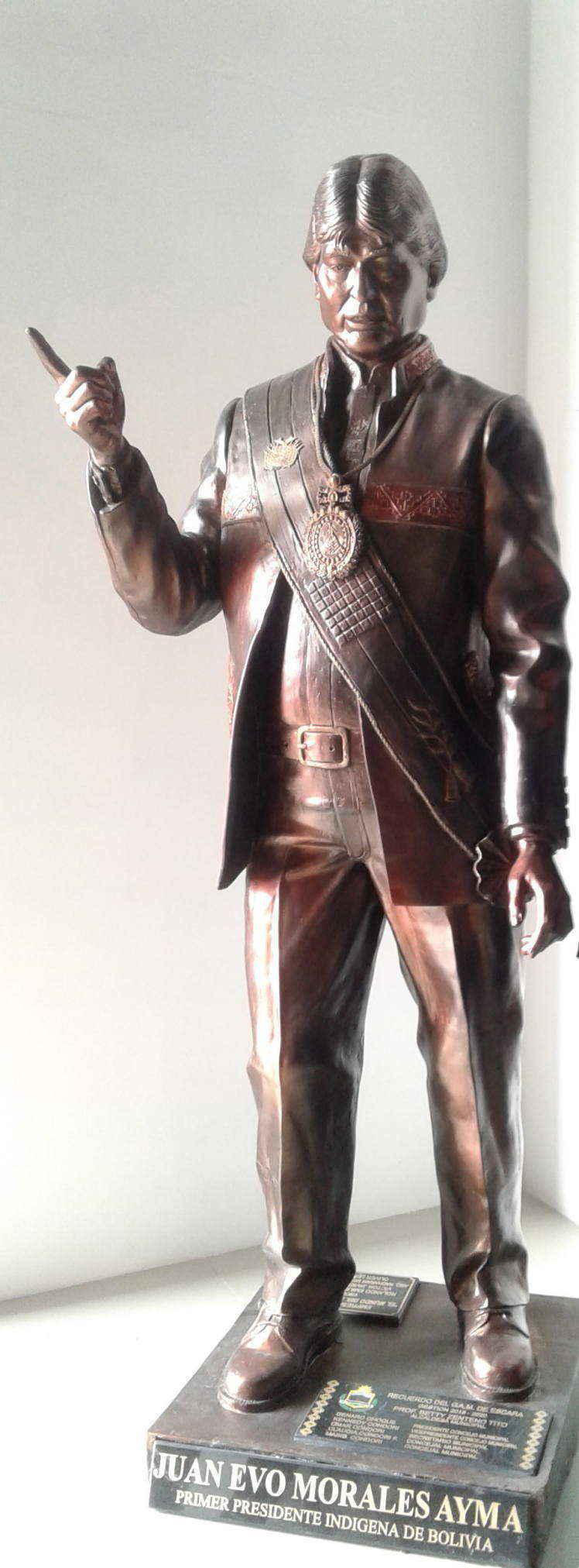 Una imponente estatua de Evo Morales da la bienvenida al museo a todos los visitantes y les recuerda, que él es perdurable y que el museo trata sobre él, en una leyenda te recuerda que él es "Juan Evo Morales Ayma, el primer presidente indígena de Bolivia" no podía faltar ese dedo índice apuntando hacia arriba, como si de un dictador se tratara.