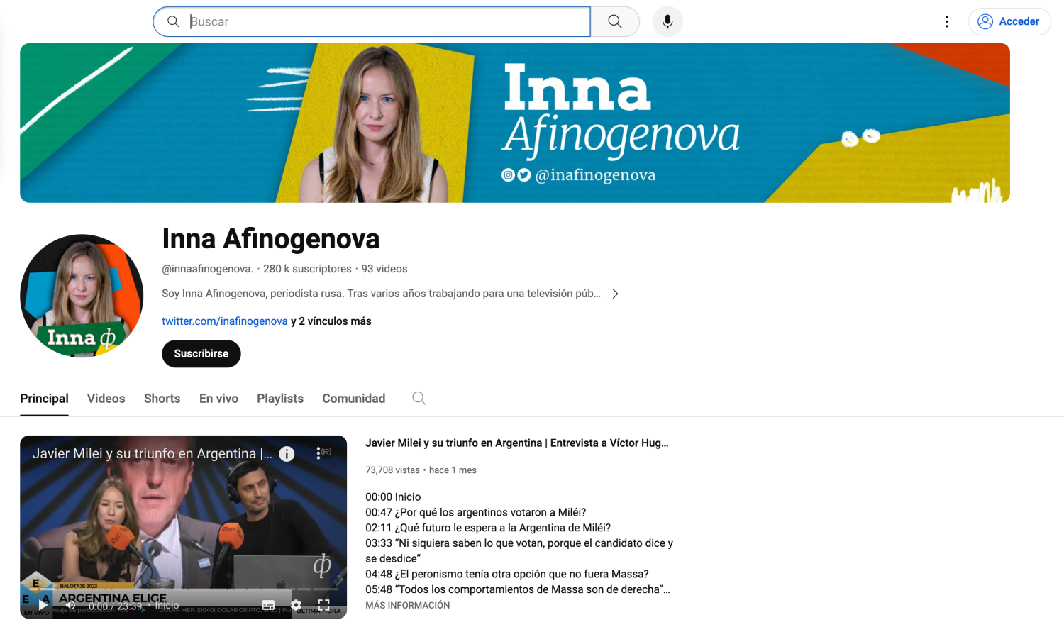 Inna Afinogenova se autodenomina como una "periodista independiente", aunque un análisis de su contenido revela una clara inclinación hacia la retórica rusa. Su canal en YouTube presenta entrevistas con analistas políticos, en su mayoría favoreciendo la perspectiva rusa. La naturaleza de sus titulares deja entrever la orientación de esta "periodista independiente", especialmente considerando su historial previo como responsable de otro canal prorruso llamado "Ahí les va", que, en esencia, parece haberse replicado en el nuevo canal bajo su propio nombre, Inna Afinogenova.