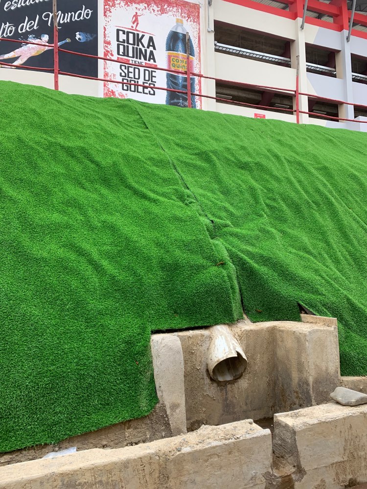 Esta es una de las imágenes que los medios deportivos evitaron mostrar. Lamentablemente, la alcaldía de Eva Copa optó por una improvisada instalación de césped sintético, utilizando fierros de construcción para engrapar cada sección. Lo más vergonzoso es que este césped artificial fue colocado directamente sobre tierra sin nivelar, literalmente sobre escombros.